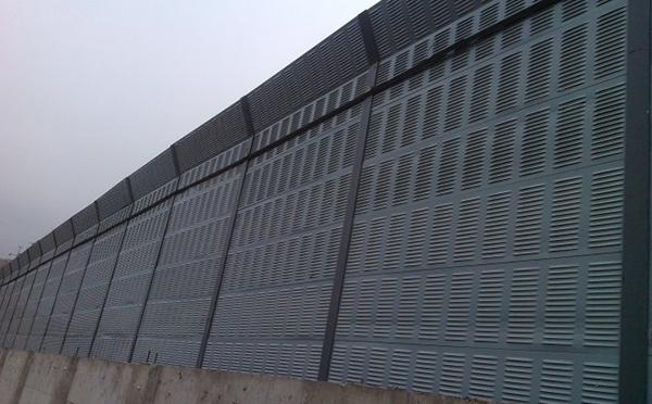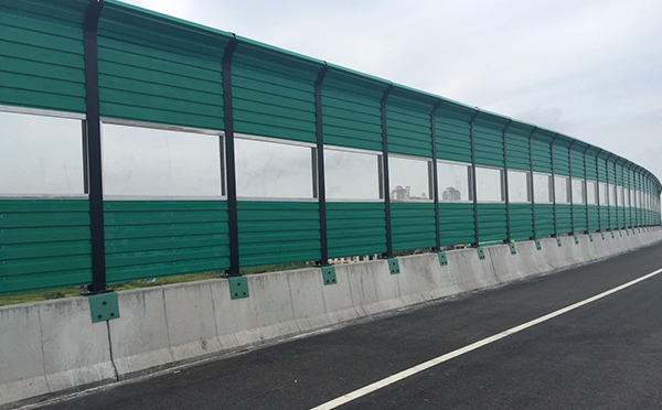 高架橋聲屏障目前常用的是吸聲和隔聲混合型聲屏障,高架橋聲屏障由上下部分金屬百葉吸聲屏、中部透明隔聲共三屏組成,整個(gè)屏障呈弧形。